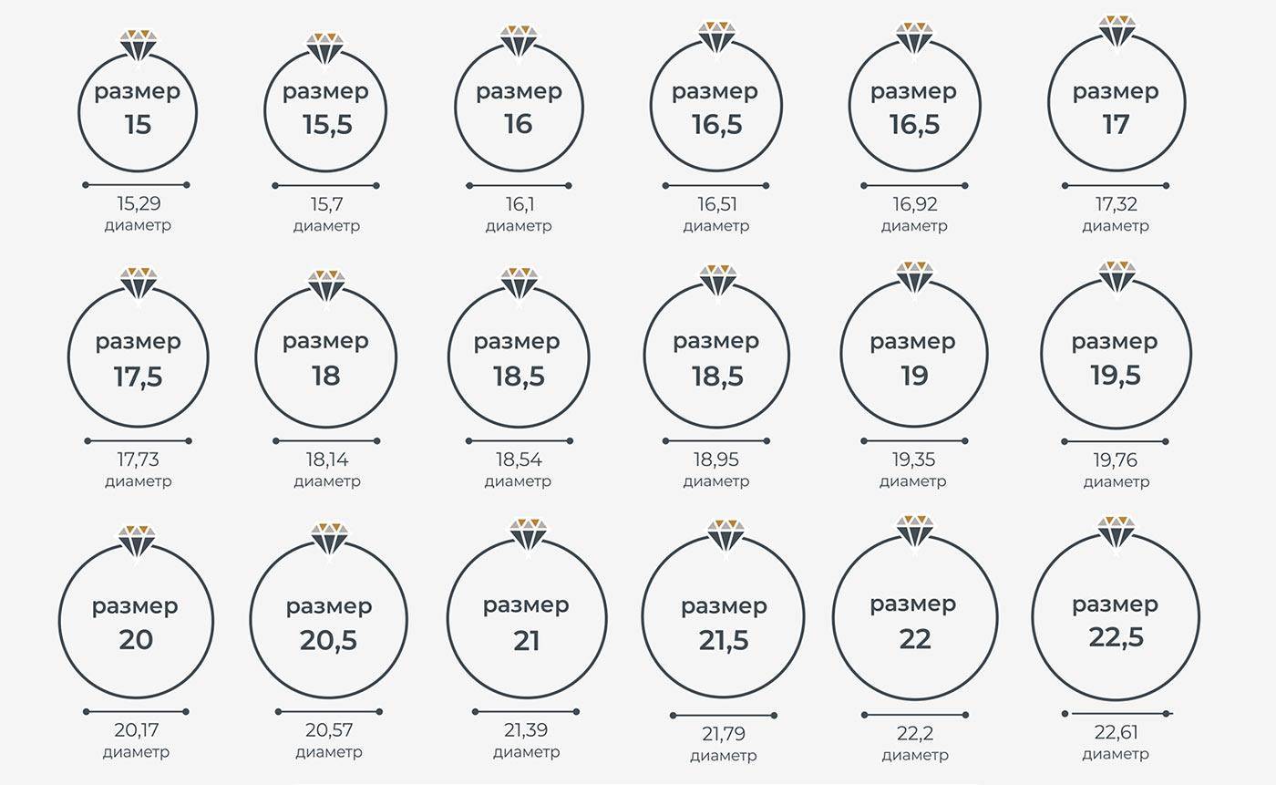Вычислив протяженность окружности пальца, возможно узнать его диаметр – это и станет размером украшения. Затем делится данная цифра на число Пи, а после выбирается ближайший показатель из ряда 14-25 с шагом в половину миллиметра.
