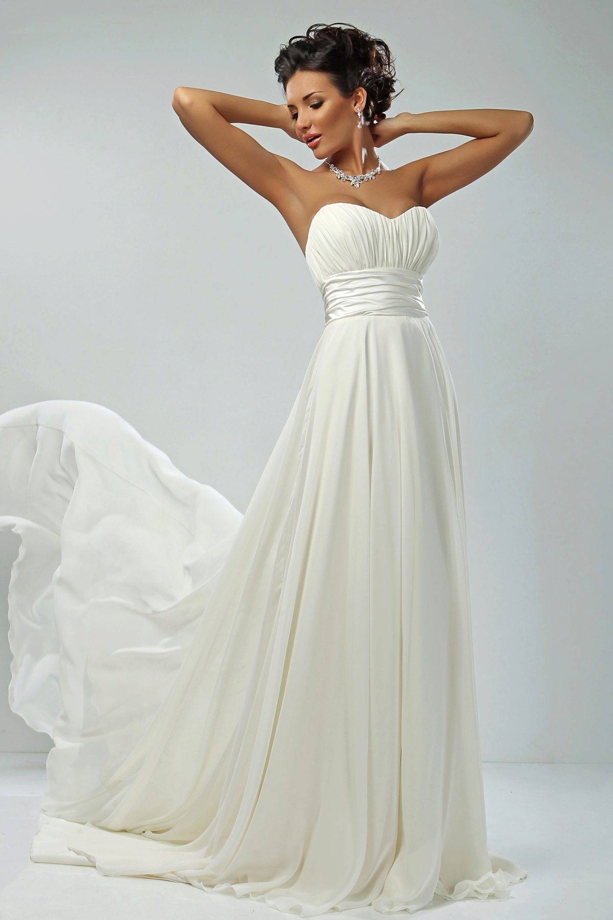 Свадебное платье силуэта «Ампир» или в греческом стиле имеет завышенную линию талию, которая начинается высоко под грудью. От этой линии платье плавно спадает мягкими, струящимися складками до самого пола.