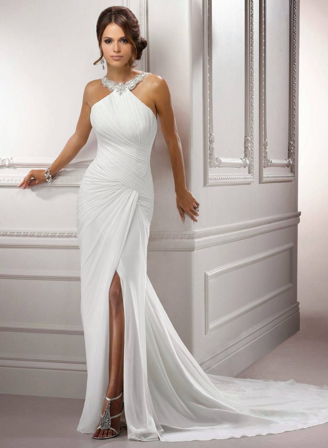Прямые свадебные платья с разрезом добавят образу интриги