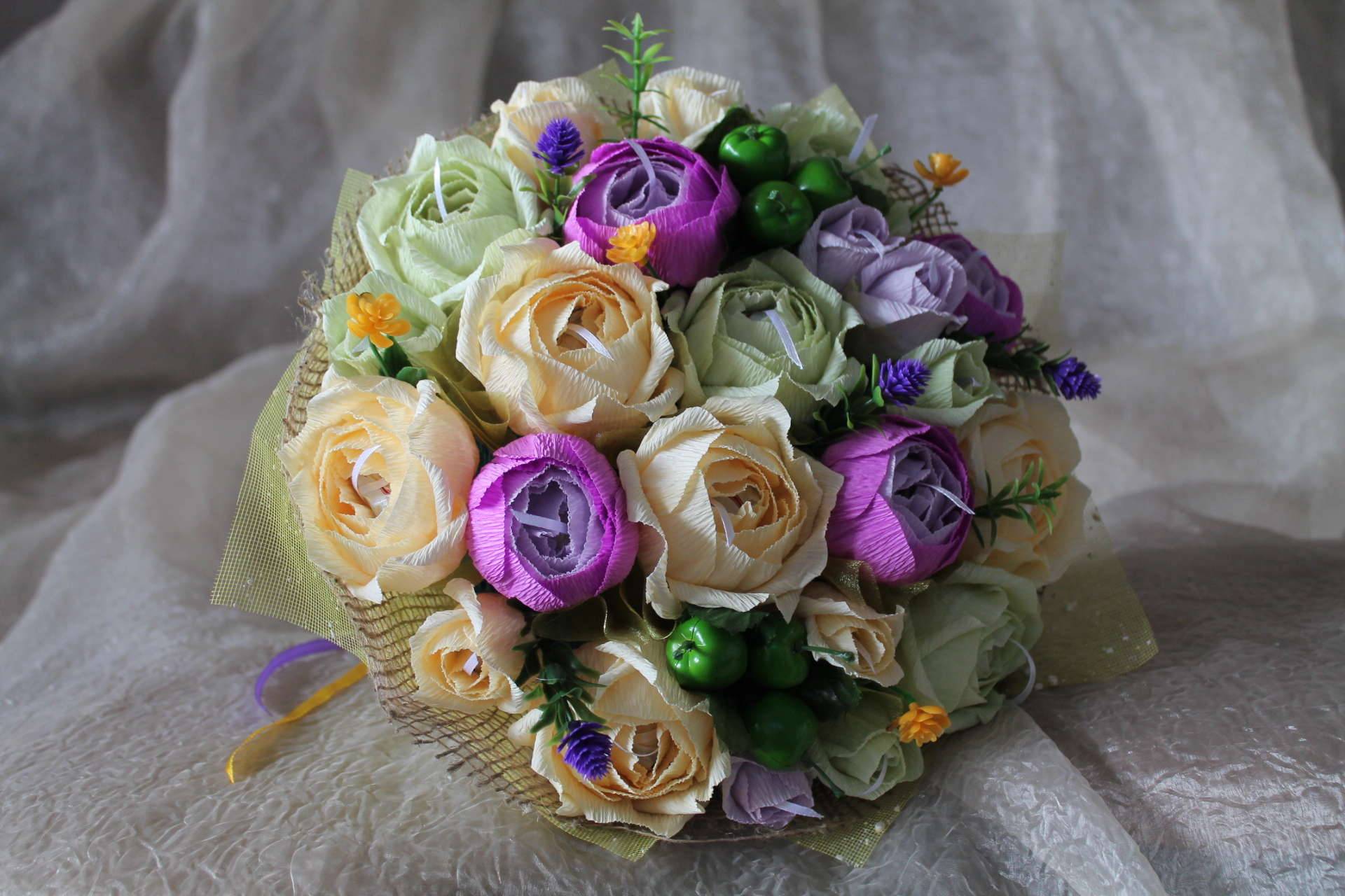 Лепестки соединяют ниткой и прикрепляют к основе – шару из пенопласта, монтажной пены или мятых газет. Букет получится уникальным и памятным.