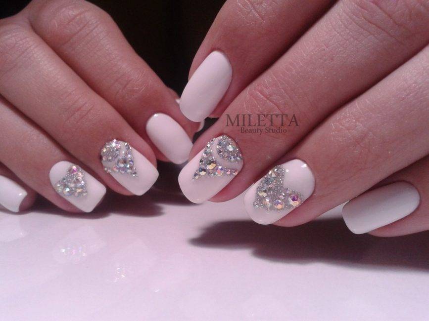 Невеста в день свадьбы должна сиять, начиная от кончиков пальцев и заканчивая диадемой. Поэтому многие девушки отдают предпочтение маникюру со стразами. Причём рекомендуется выбирать не обычные, недорогие стекляшки, а стразы Swarovski.