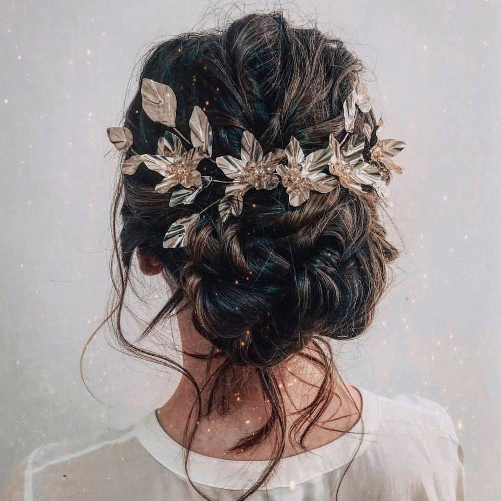 Модная прическа с дополнительными украшениями в виде шпилек, каждая из которых украшена крупным камнем. Такой вариант подойдет девушкам, выбравшим платье приталенного силуэта или с глубоким декольте.
