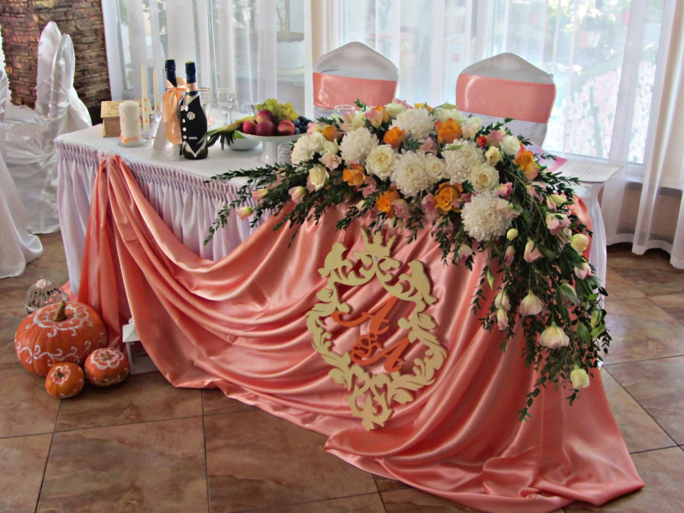 Оформление свадебного стола жениха и невесты – на нем должно акцентироваться внимание гостей. Если выбрано оформление тканями, значит, стол обрамлен тканью яркого цвета и в большом количестве