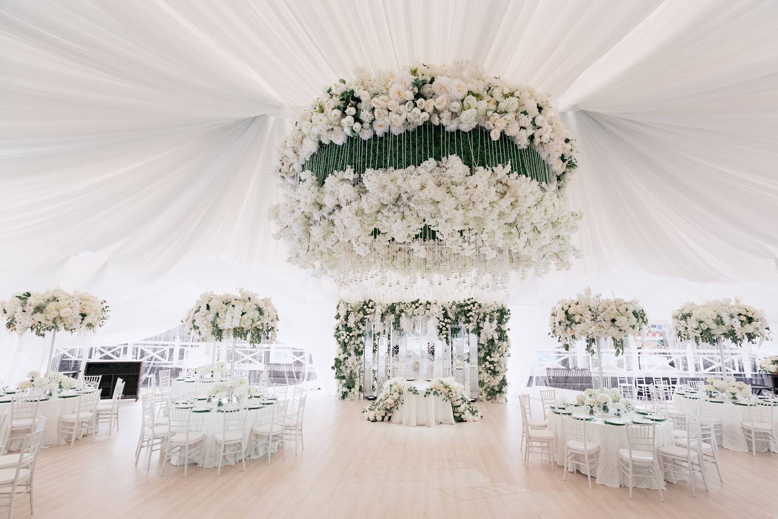 Красиво выделенный самой крупной и высокой композицией из белых цветов стол новобрачных