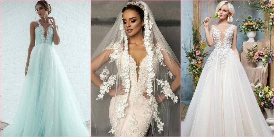 Более скромные новобрачные могут выбирать варианты, где область декольте прикрыта прозрачной тканью.