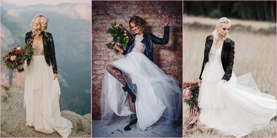 Для девушек, которые хотят выделиться из общей массы остальных невест и не представляют свой образ без провокационных аксессуаров, наверняка понравится дизайнерская смелая идея – надеть на праздничное платье кожаную байкерскую куртку.