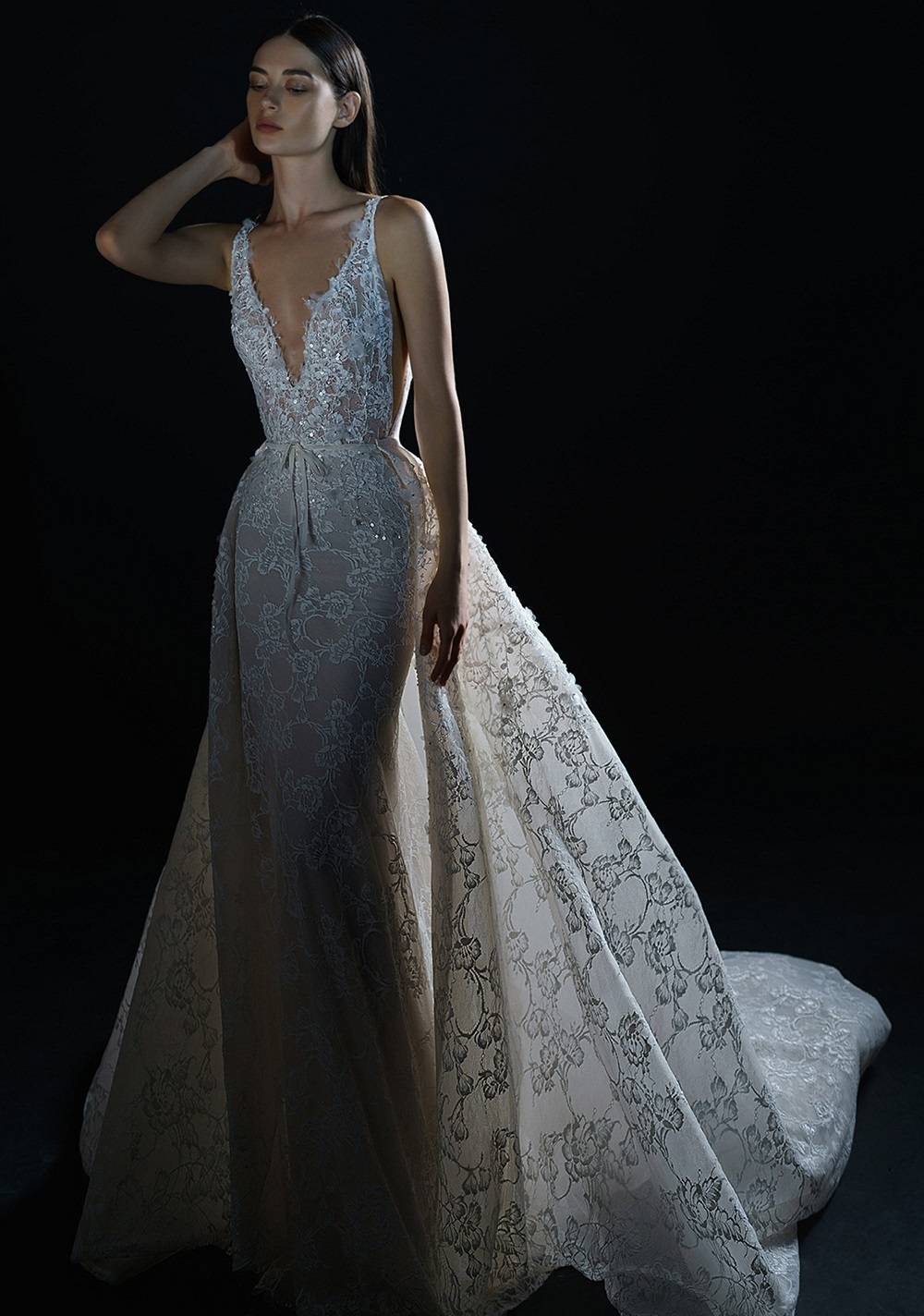 Подвенечные наряды с кружевом и эффектом тату — тенденция, которую дизайнеры продемонстрировали практически на всех показах. Смотрятся такие модели весьма экстравагантно: их украшает полупрозрачная сетка бежевого цвета, декорированная вышивками. Подобные вставки могут быть на рукавах, груди и даже на подоле.