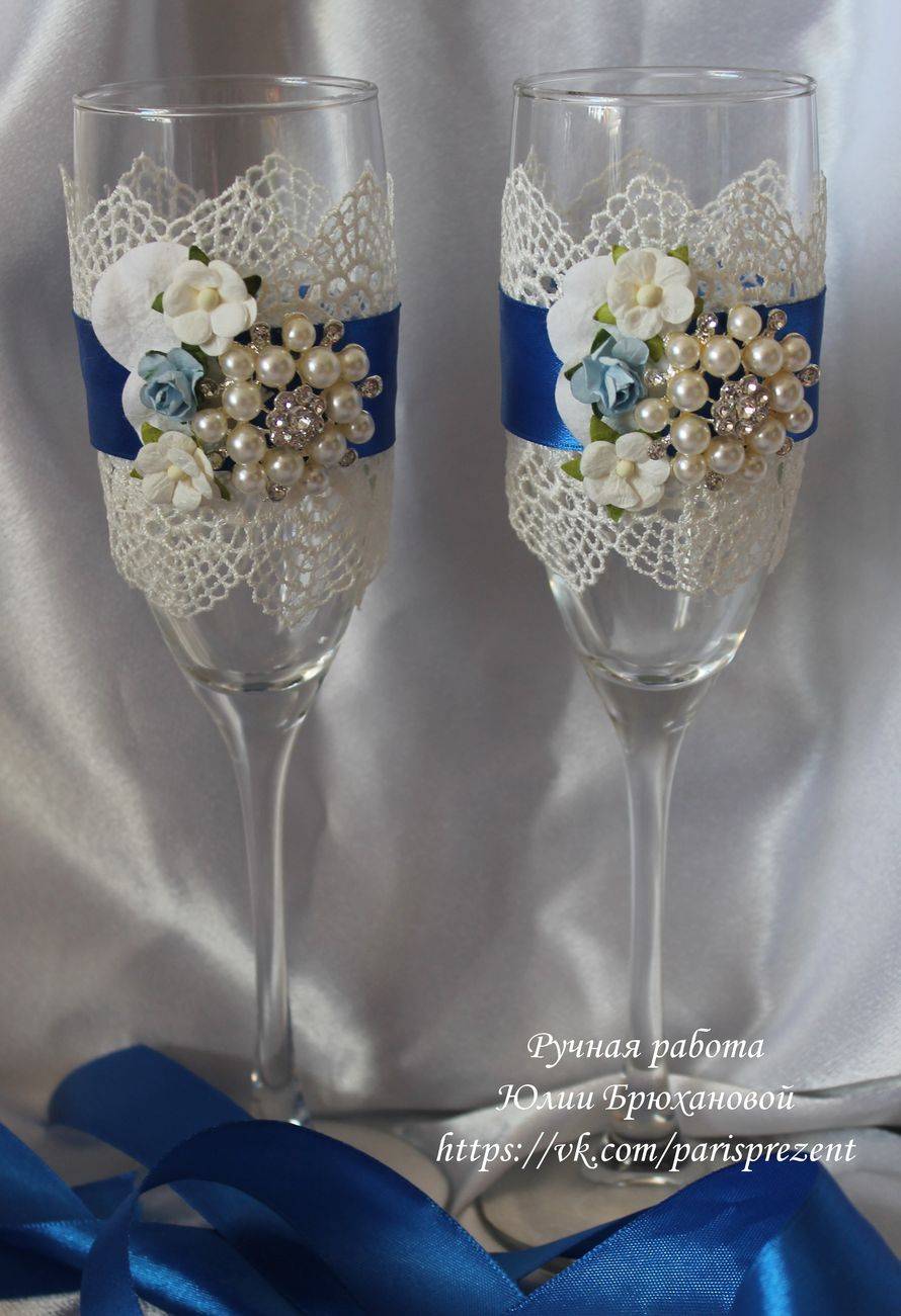 Проще способа сделать красивые бокалы на свадьбу не стоит и искать. Здесь даже особо не нужен мастер-класс. Обклеить кружевом их поверхность можно в любых вариациях. В каждом случае смотреться такой декор будет изящно. Допустимо провести ассоциацию с платьем невесты.