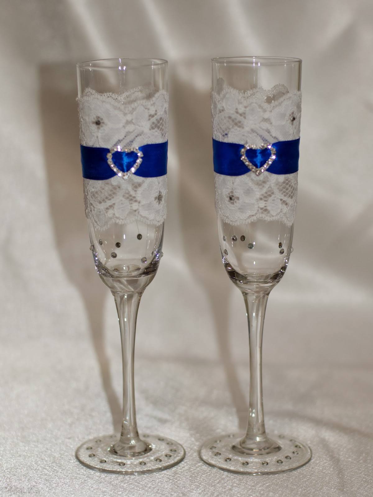 К примеру ножку бокала дополнить бантиком из ленты небольшой ширины или приклеить стразы, бусины, блестки также с помощью клеевого пистолета.