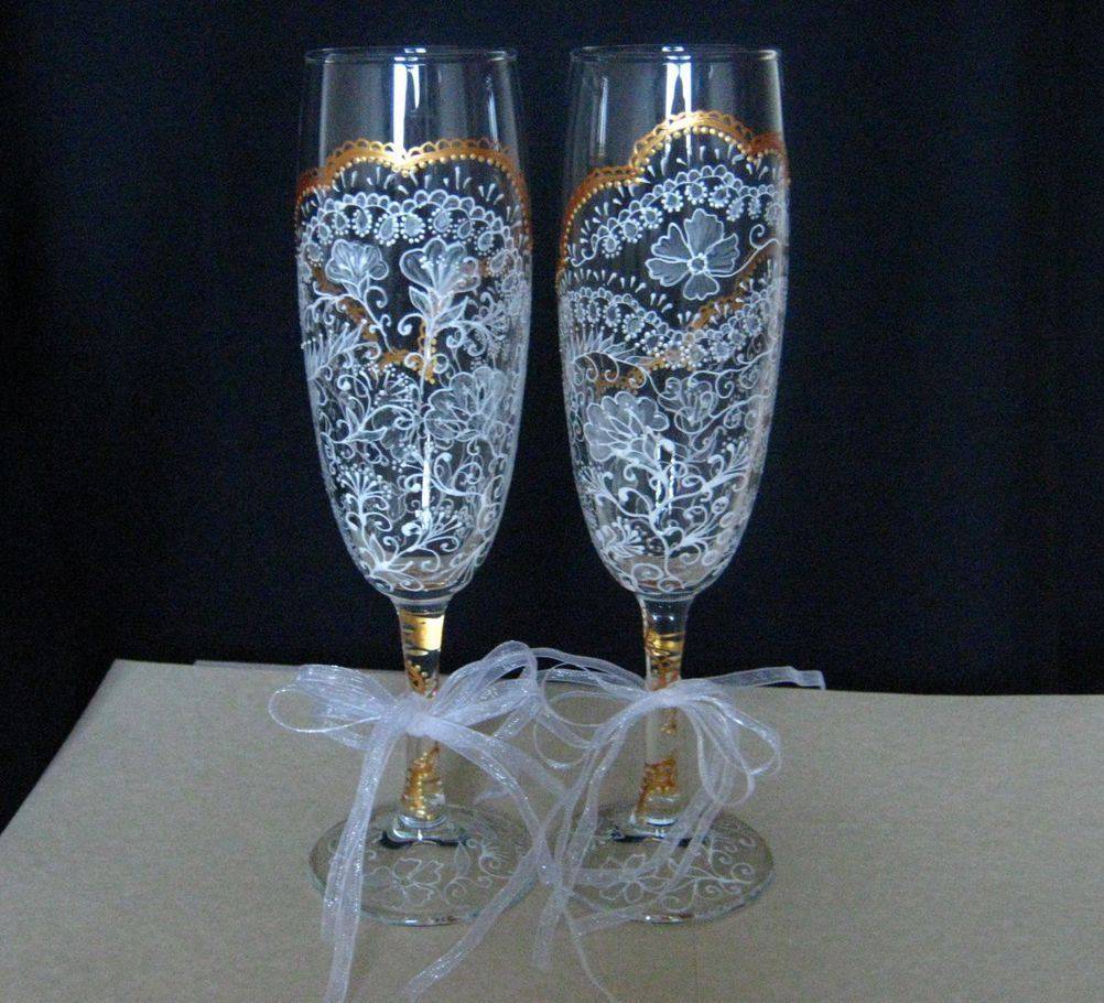 - Декорирование красками. Отличная идея расписать бокалы для шампанского. За основу взять акрил. Стекло обезжирить спиртом или ацетоном. Рисунок распечатать и перенести на поверхность бокала. Теперь приступим к росписи. Ждем, пока краска подсохнет и закрепляем рисунок лаком. Дополним роспись лентами, стразами,пайетками. Узоров – целое море в интернете, остается выбрать свой. Оформляем фужеры нарядной лентой. Такой декор – не слишком затратный, но позволит разгуляться фантазии и мастерству. Подойдет атлас и кружевная лента для бантика, который нужно укрепить на ножке или в основании бокала. Восхитительно смотрится и розочка из ленточки, приклеенная на стекло. Для декора подойдут ленты одинаковой и различной ширины, в одном и разных цветовых тонах – у жених ярче, у невесты – светлее.