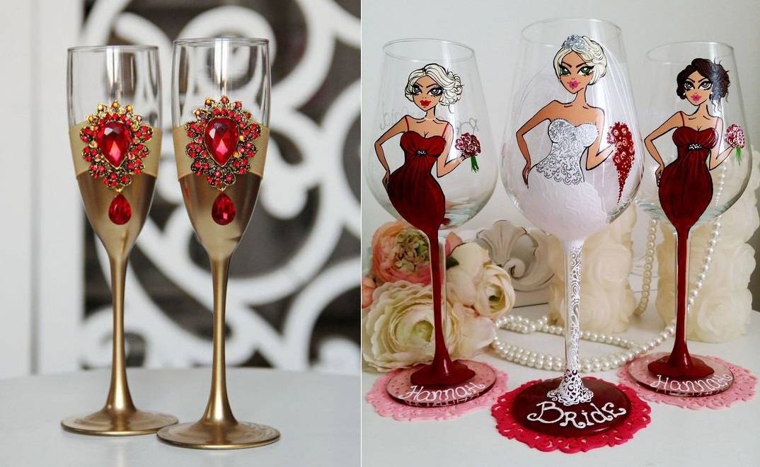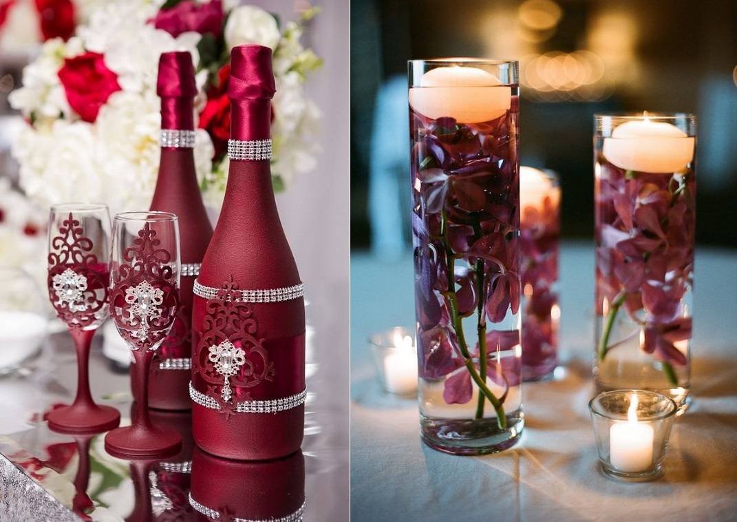 Декор свадьбы марсала не требует множества оригинальных предметов. Наоборот, несмотря на то, что этот оттенок ассоциируется с роскошью и шиком, достаточно будет скромных украшений. Например, в их роли может выступать посуда, интересные свадебные бутылки и фужеры в цвете марсала, бордовые свечи в золотых подсвечниках, шикарные букеты. Бокалы для жениха и невесты украшают цветами или лентами нужного оттенка.