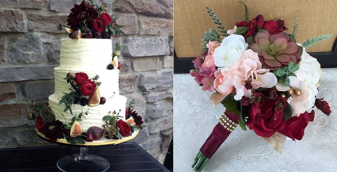 - Торты, украшенные живыми цветами; Цветы используют в основном для многоярусных тортов. Это могут быть торты из мастики, по которым волнами спускаются цветочные композиции. Украшают таким образом и кремовые десерты, и любые другие. Можно подобрать несколько бутонов цвета марсала в сочетании с нежными, тёплыми цветами. Их лучше разместить на верхушке десерта в виде букета.