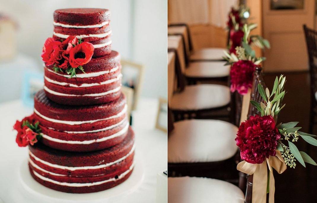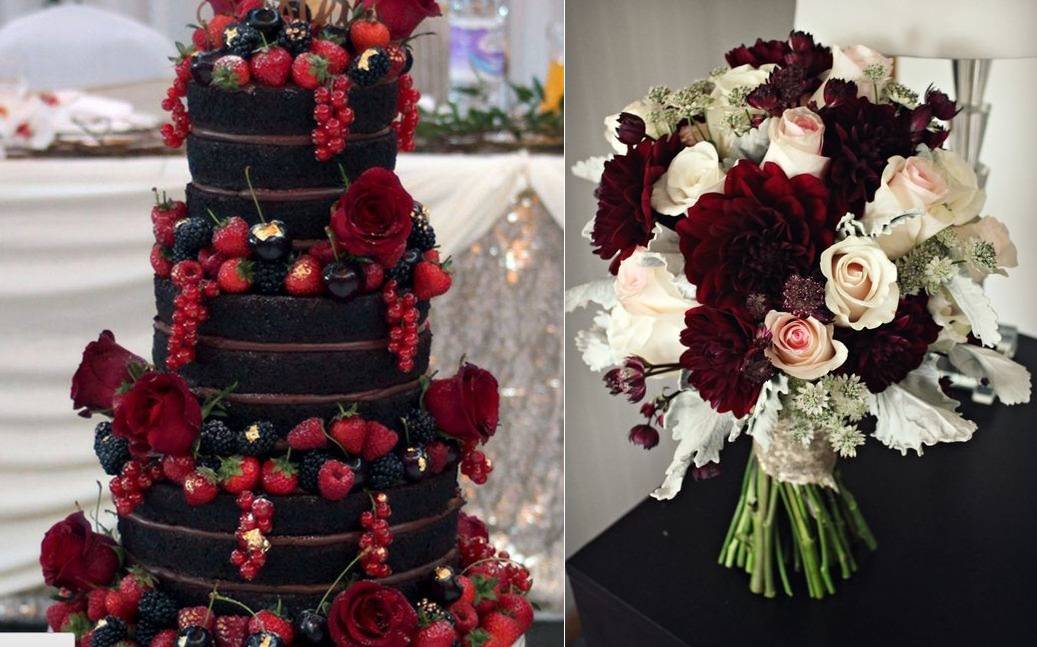 - Многоуровневый торт; Украшается сладкими кружевами, бахромой, цветочными композициями. Оттенки бордового отлично сочетаются с цветом айвори, золотом, лёгкими оттенками розового, бирюзы.