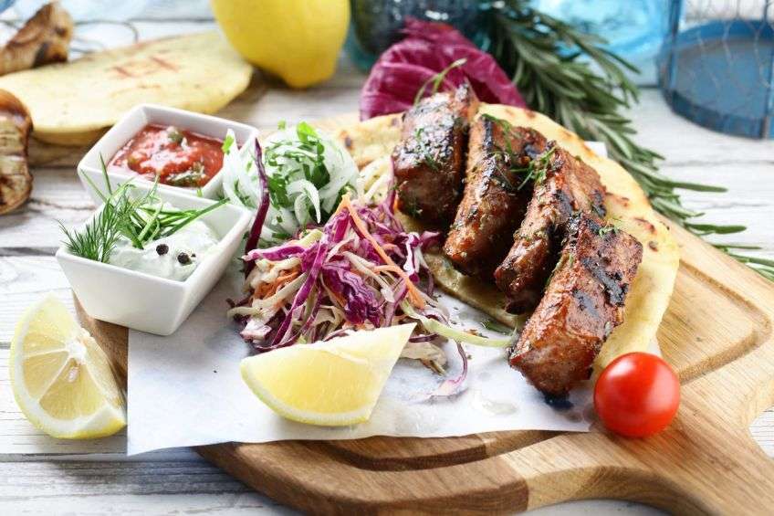 Из традиционных свадебных кушаний в Греции подают мезе – это маленькие закусочки к вину. Обычно они состоят из сыра фета и маслин или морепродуктов. Популярным блюдом являются и долма – смесь фарша, риса и овощей, которая подается в виноградных листьях – очень похоже на украинские голубцы. Ни один свадебный пир не обходится без сувлаки – баранина или свинина, приготовленная на открытом огне и подаваемая на шпажках.