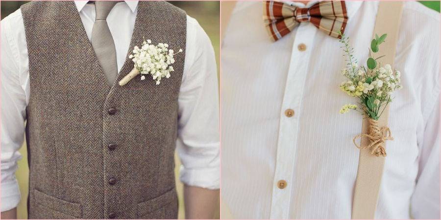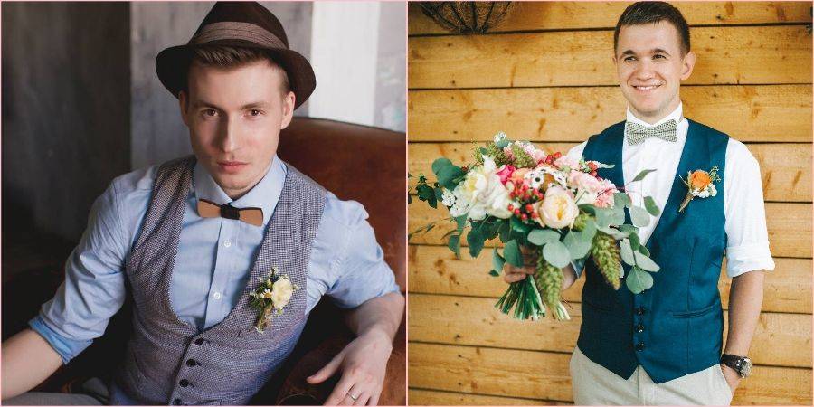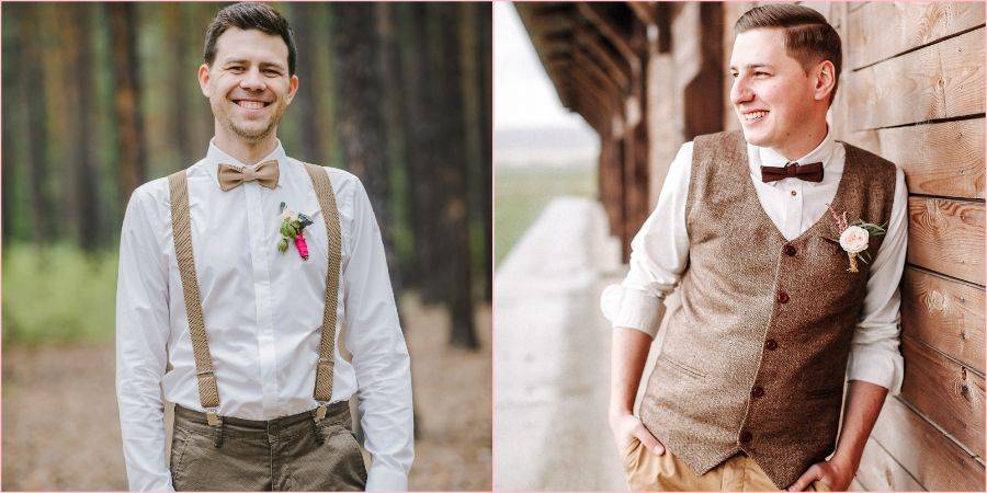 Мужской образ — это удобство и простота. Жених может спокойно отказаться от классического костюма, отдав предпочтение широкой рубахе, красивым штанам любого цвета, кроме черного, стильным подтяжкам, жилетам. Дополнить образ могут шляпы, которые обычно носят в деревне, стильные бабочки. Ткань костюма подойдет клетчатая, а вместо пиджака хорошо впишется вязаный джемпер. Закончить образ поможет бутоньерка из сухоцветов, снопик колосков или букетик полевых трав, приколотых к одежде.
