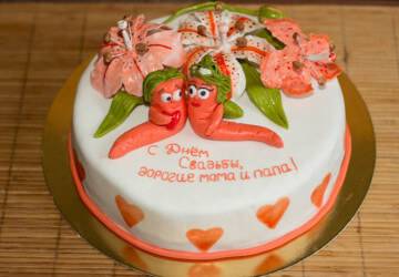 - Торт на годовщину свадьбы в домашних условиях также оформляется особым образом. Поздравительная надпись, имена супругов, количество прожитых вместе лет – все это можно отразить в кондитерском изделии для застолья по случаю праздника. Пусть годовщина празднуется не так пышно, то красивый десерт будет очень уместен. Также популярностью пользуются декоры с юмористическим уклоном, сделанные своими руками.