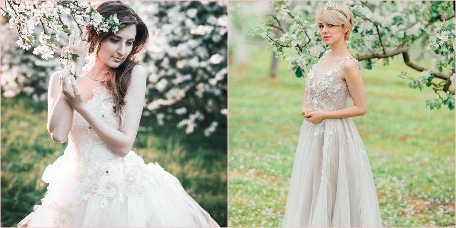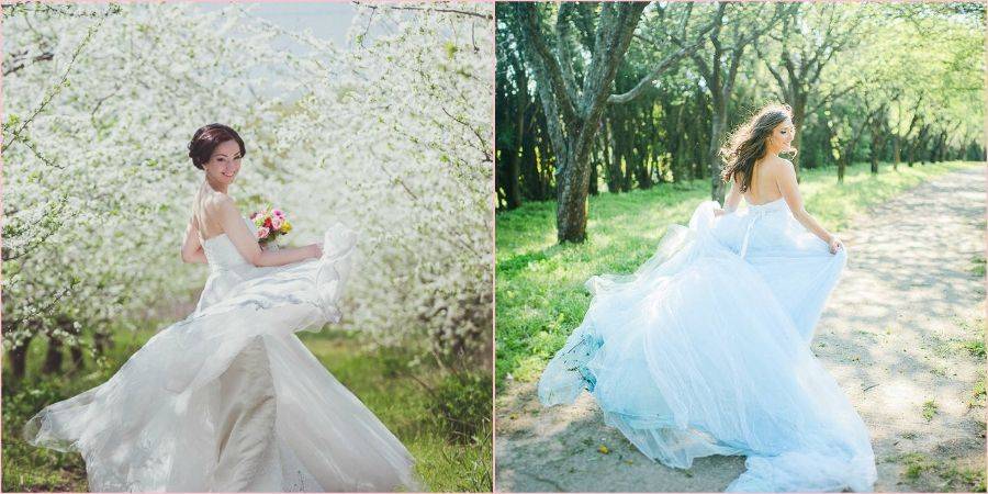 На раннюю весну подойдут наряды из более плотной ткани – атласа, парчи, жаккарда, шелка, крепа, сатина или тафты, а на позднюю хорошо выбрать варианты полегче, например, из органзы или кружева.
