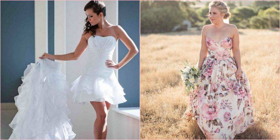Платье-трансформер станет замечательным выбором для торжества в рассматриваемое время года. Длинная юбочка будет уместно смотреться на новобрачной в прохладную погоду, а вот если свадебный день выдастся теплым и солнечным, то можно оголить ножки и пощеголять в коротком коктейльном платьице, отстегнув макси юбку. Также уместно будут смотреться легкие струящиеся юбки и наряды с цветочными принтами.