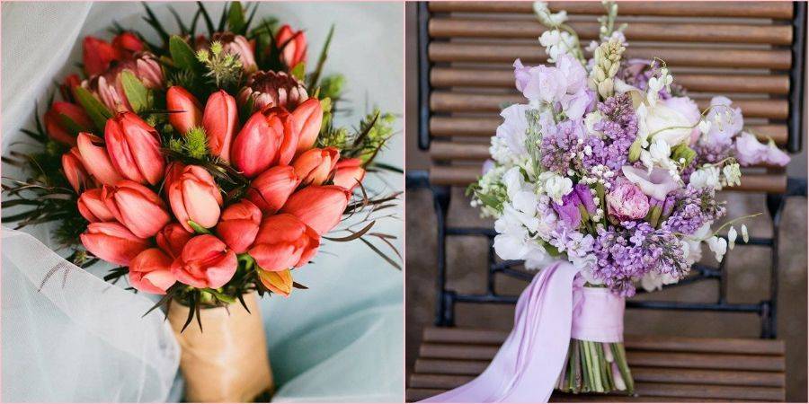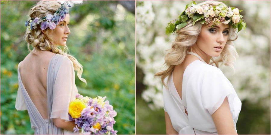 В качестве прически идеальный вариант – это слегка растрепанные волосы, распущенные или собранные в небрежный пучок, еще одно прекрасное решение заплести ажурные или объемные косы, а также в греческом стиле. Главное сохранить естественность и непринужденность в весеннем образе новобрачной. Декорировать укладку актуально бутонами цветов или венком.