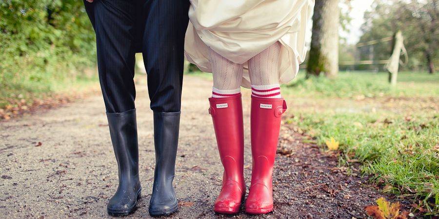 Помните, что образ жениха должен полностью сочетаться с невестой, поэтому если девушка использует в своем наряде яркие аксессуары, например, резиновые сапожки, то и парню будет хорошо тоже обуться в них.