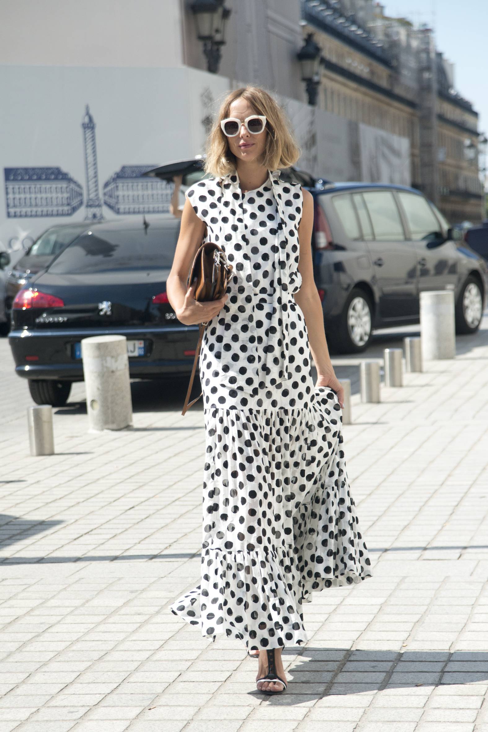 Платье-бохо в горох выглядит мило и женственно. Принт используется как главное украшение или присутствует только в отделке, например, в оборке по краю. Стильный вид имеют вещи черного, коричневого, песочного цвета с белым горохом.