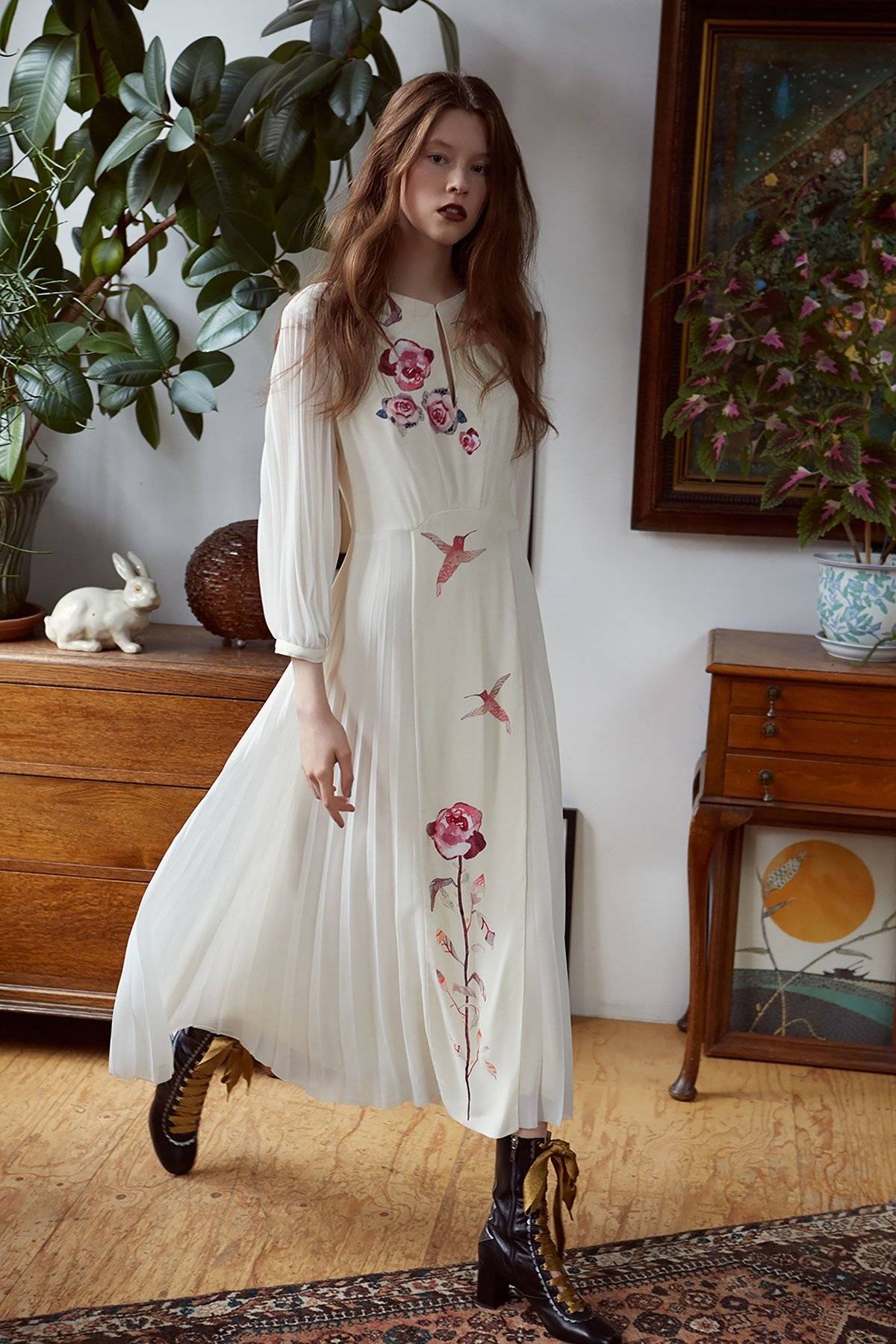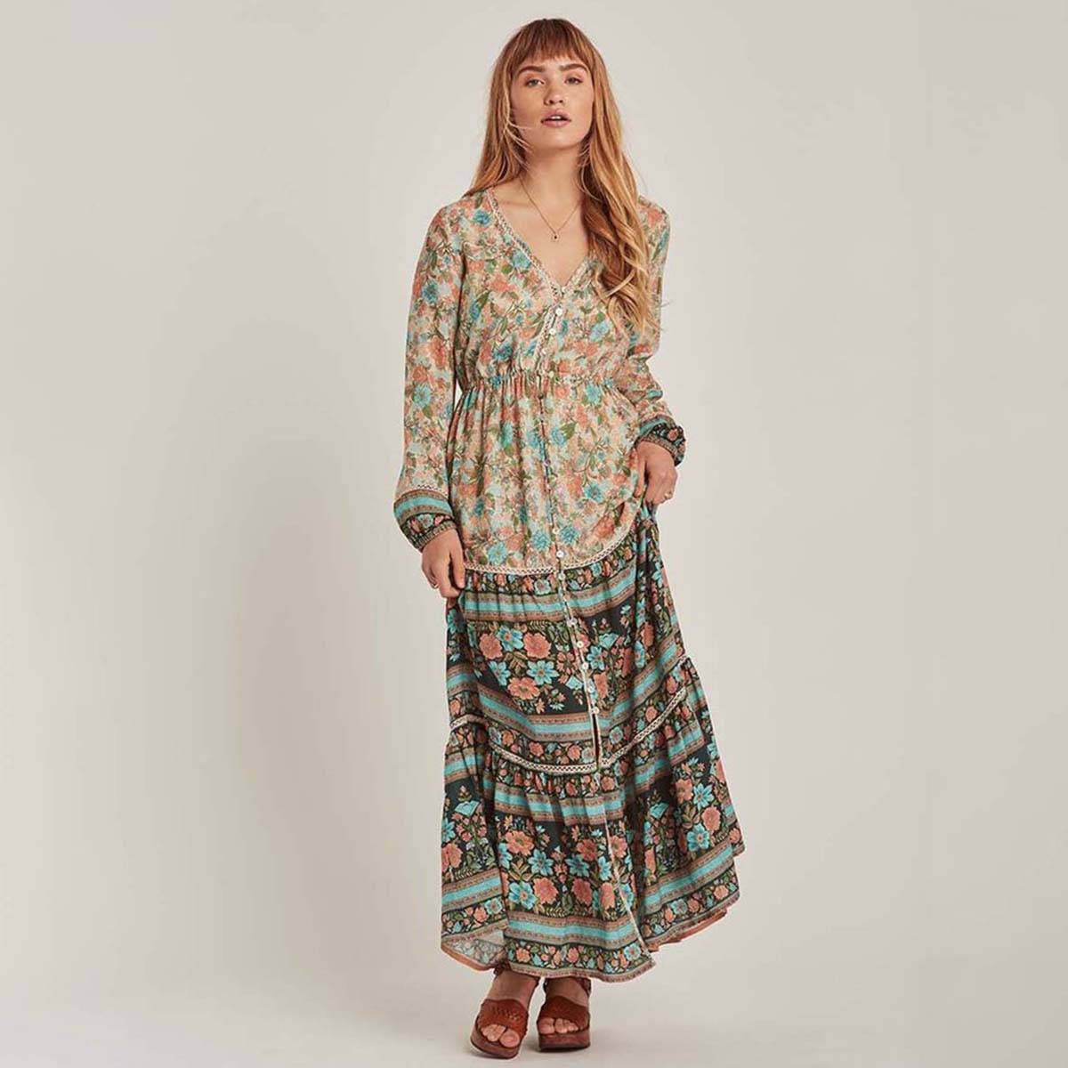 Цветочные мотивы — непреходящий тренд бохо-стиля; успехом пользуются как миниатюрные, так и крупные принты. Стильное сочетание получается с темно-серым, молочным, кофейным фоном.