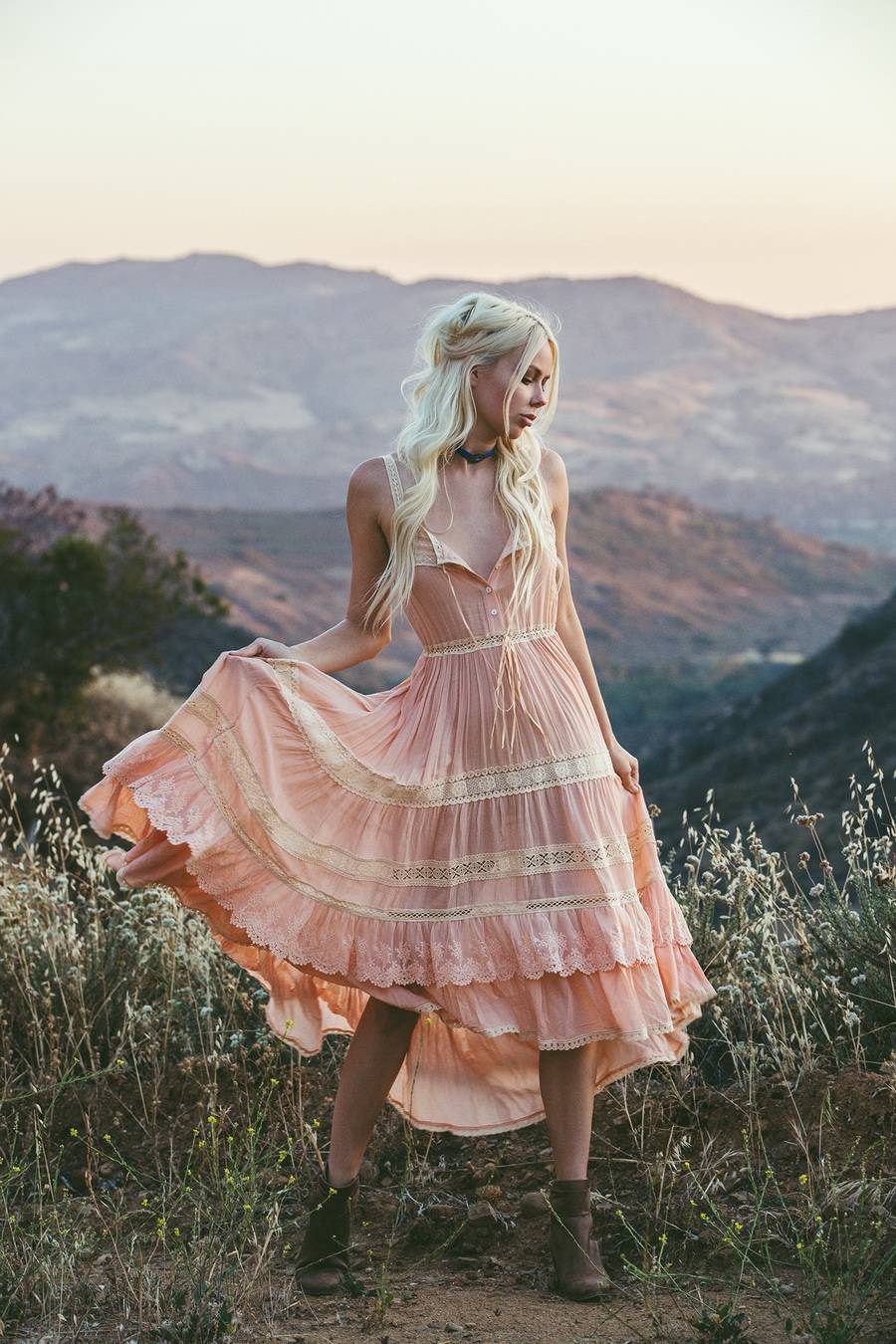 Обувь можно выбирать практически любую за исключением неудобных туфель на шпильках. Уместными будут и босоножки на плоской подошве с кожаными ремешками вокруг икр, и грубоватые сапоги, казаки или ботинки.