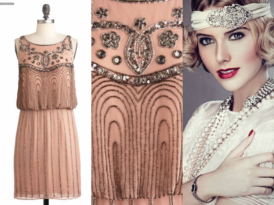 Для справки: в 30-х годах дамы носили платья до лодыжек, а в 20-х – до колена. Короткие и изящные платья украшают стразами, бисером и пайетками, на них нашивается бахрома, или все платье покрывается нитью – серебряной или золотой.