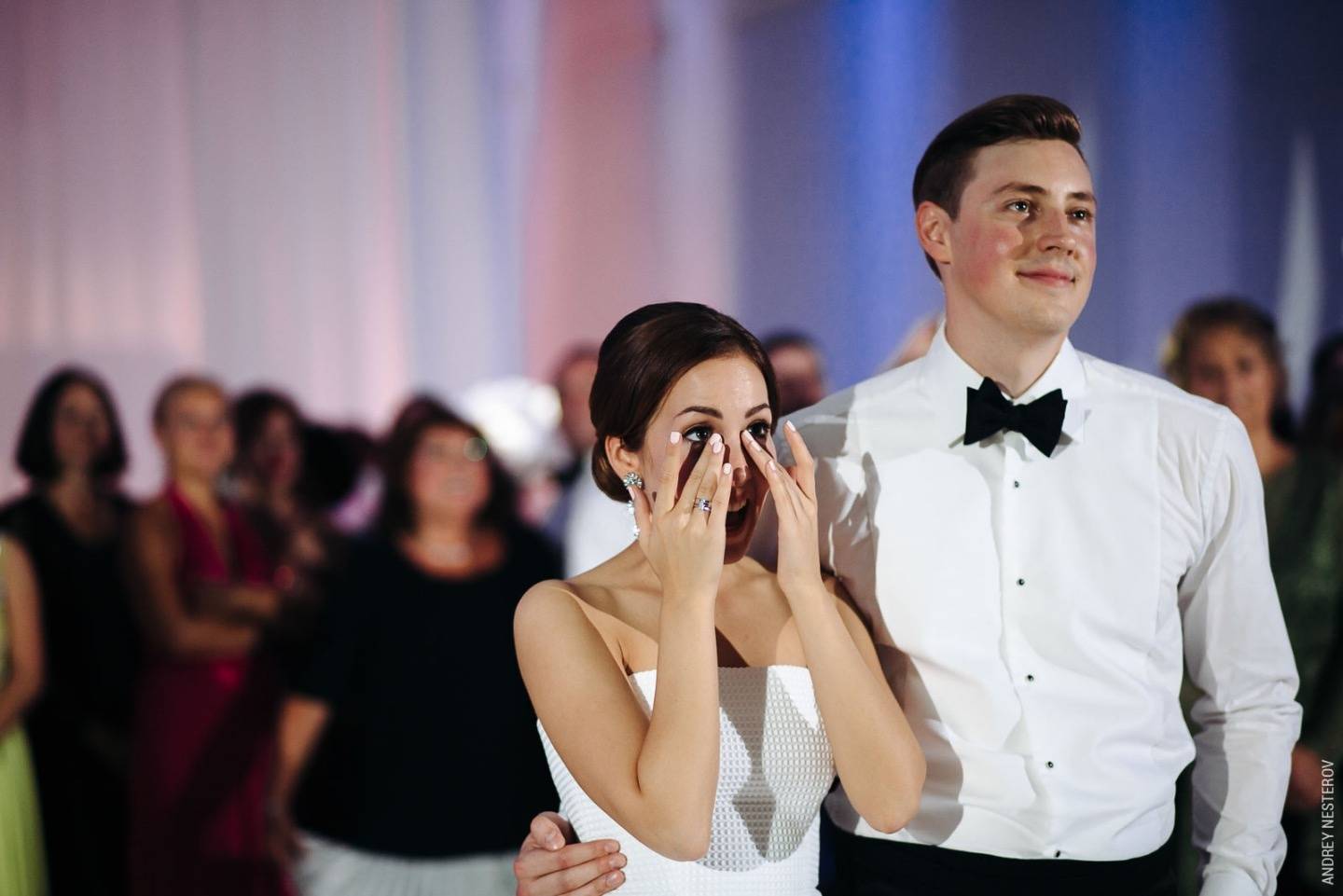 Онлайн трансляция регистрации брака из дворца и неожиданное эффектное появление пары задали настроение вечера, полного сюрпризов как для гостей, так и для молодоженов. Творческие выступления родственников, лучшие каверы в сопровождении оркестра, барабанное шоу, фейерверк на набережной — все это подарило одной большой Петербургской семье незабываемый вечер.