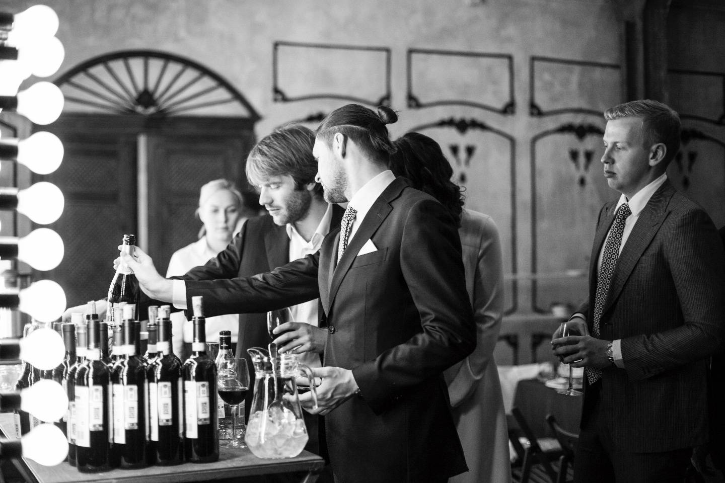 - • Вместо стандартных перемен блюд и традиционной рассадки гостей за отдельными столами, мы выбрали один длинный стол для всех и поставили фуршетную линию с едой.