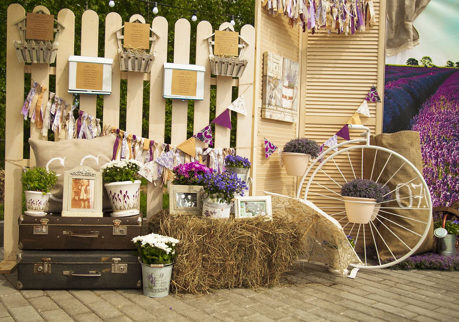 Один из обязательных элементов свадьбы в стиле прованс – обычный велосипед, на багажнике которого стоит плетеная корзина с лавандой. Он считается символом традиционной французской деревни. Его следует разместить возле входа в зал, где будет проходить свадебное мероприятие.
