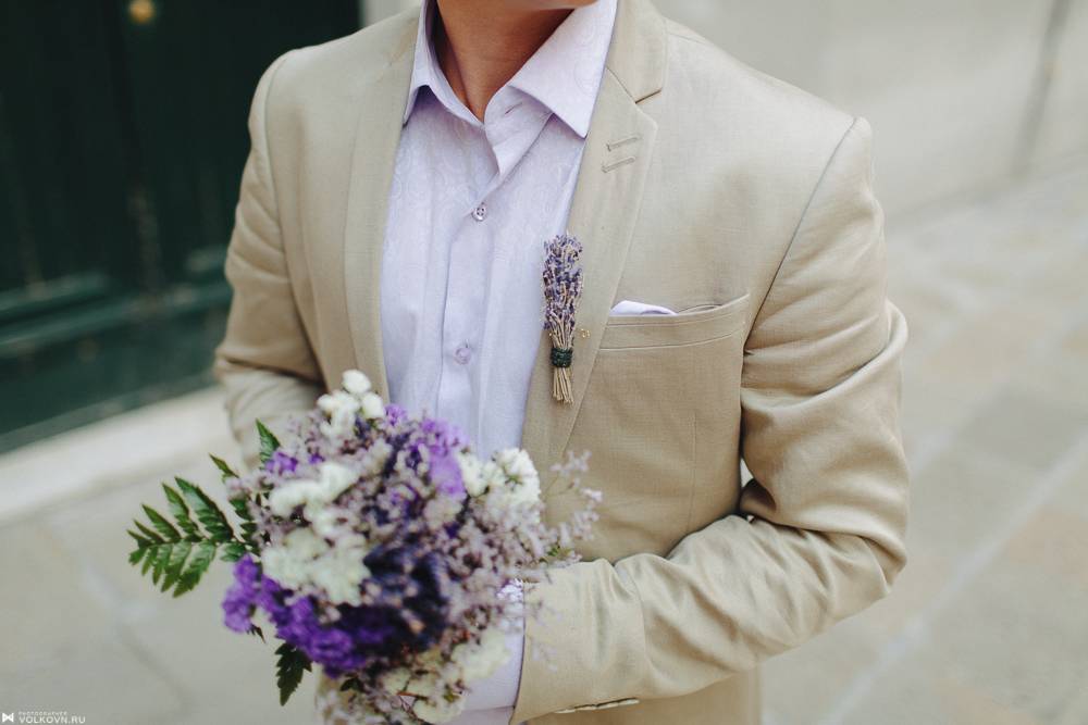 Для жениха подойдет не классический черный костюм, а нестандартной расцветки и мягкой ткани (например, сшитый из льна). Гармоничные цвета, которые будут сочетаться с платьем невесты, – пастельные. Обязательно дополнить образ синим или сиреневым галстуком.