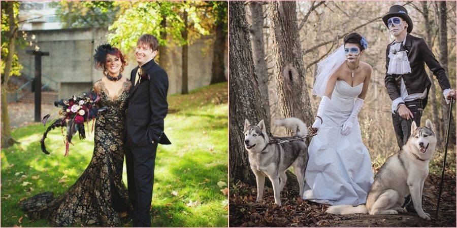 Как все знают, Хэллоуин приходится на октябрь. Поэтому креативные влюбленные могут сыграть свадьбу в стиле этого праздника. На невесте великолепно будут смотреться длинные черные перчатки, вуаль, роскошные драгоценности и, конечно же, платья под готику. Жениху для поддержания образа можно подыскать смокинг и цилиндр, а еще галстук в виде летучей мыши и запонки в форме тыкв или черепушек.