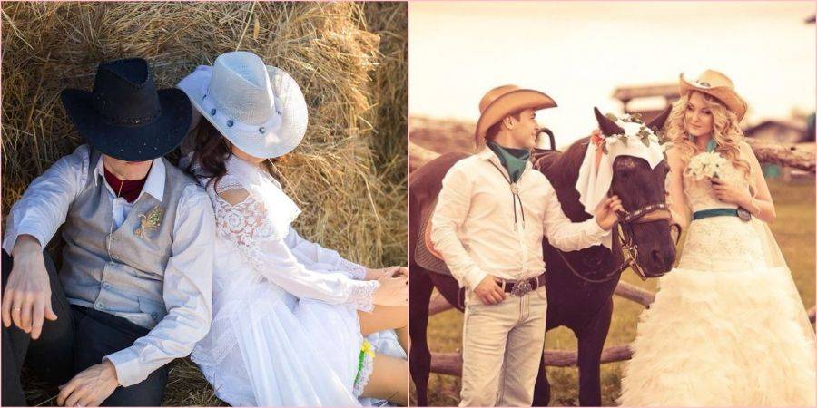 Высокие сапоги, шляпы, джинса, лошади, мешковина и дерево – все это ковбойский стиль. Организовать такую свадьбу лучше на природе, где-нибудь за городом. Отличная идея – конно-спортивный клуб или поместье с лошадьми.