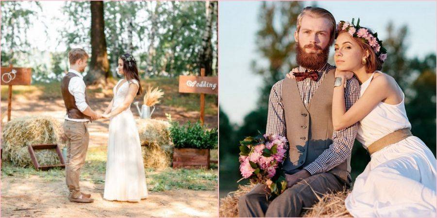 Девушке стоит облачиться в длинный сарафан или воздушное платьице, дополнить образ венком из полевых цветов и таким же букетом. На женихе отлично будут смотреться брюки из легкой ткани или джинсы в сочетании с рубашкой, жилеткой, подтяжками, фуражкой или шляпой.