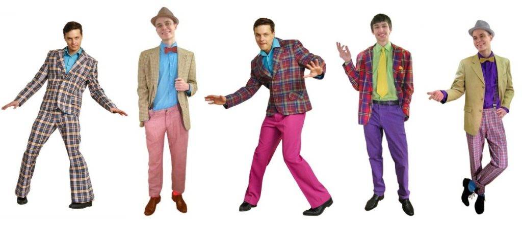 В 50-х самой модной прической был начес как у Элвиса Пресли. Но в наше время трудно найти мужскую половину населения, которые смогут позволить сделать себе такой начес. Потому прическу парней оставляем как есть J. Но вот в одежде можно разгуляться. Выбор огромен: от старых огромных пиджаков, до облегающих, приталенных пиджаков с самыми немыслимыми расцветкамии принтами. При выборе наряда не бойтесь посмотреть в сторону таких ярких цветов, как фуксия, красный, голубой, зеленый. Также мужчины-стиляги любили носить штаны-дудочки (в клеточку и с подтяжками). Неизменными дополняющими атрибутами были галстуки в горошек из атласа и солнцезащитные очки с цветными линзами.