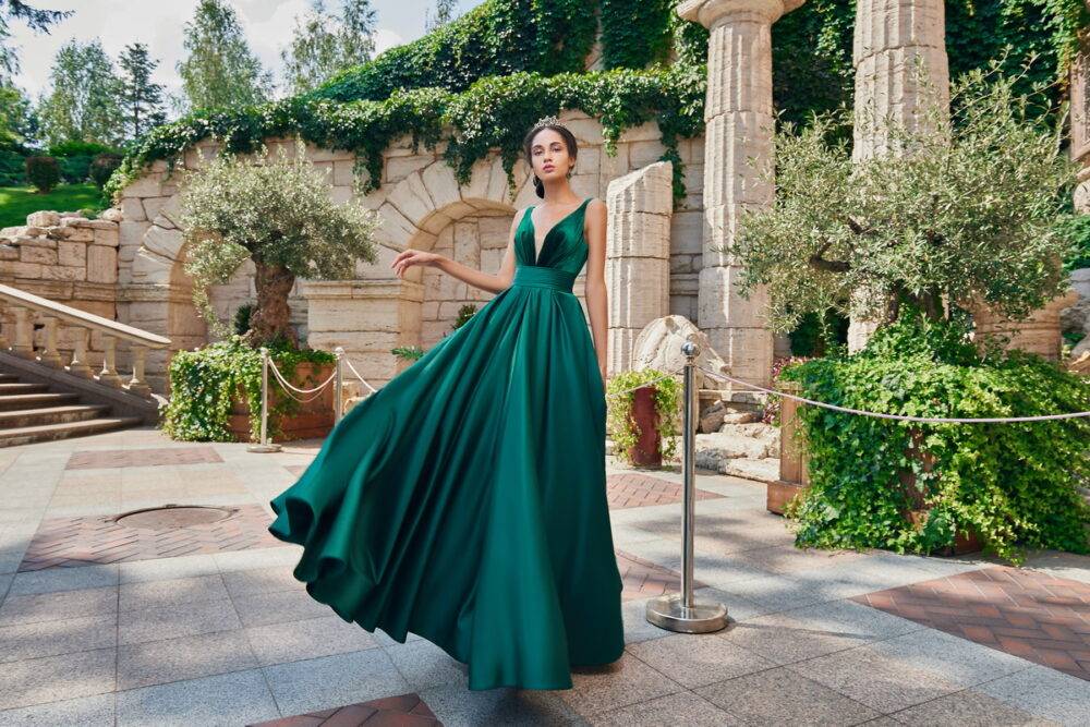 Изумруд считается прекрасным спутником бархата и шифона. Его сочетают с платьями А-силуэта или моделью «русалка». Оттенок удачно вписывается в образ с нарочитой женственностью и кокетством.