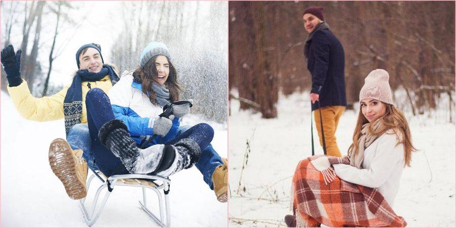Еще одна оригинальная и уместная идея для Вашей Лав стори зимой – это покататься на санках. Только надевайте теплую, но в то же время, удобную и яркую одежду: