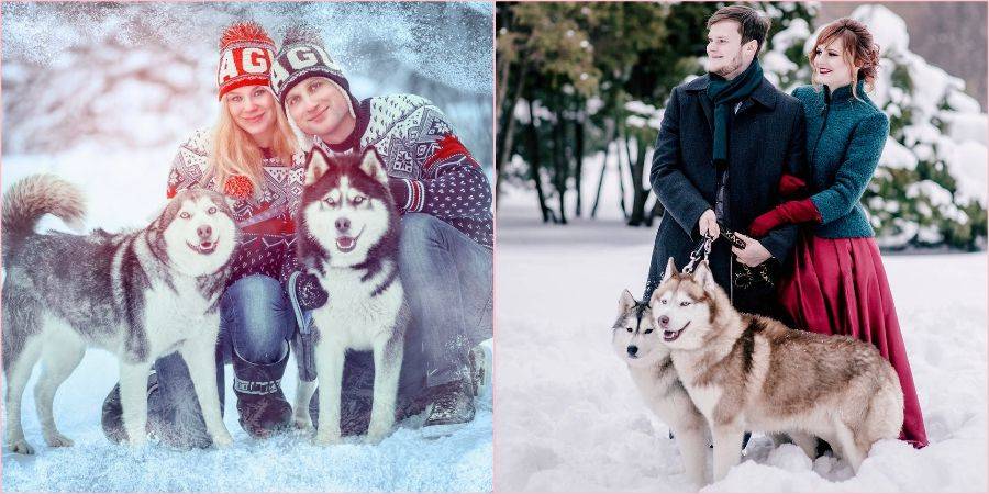 В последние годы стало модно фотографироваться с большими собаками (хаски, лайки, самоед, лабрадор и др.). Но не гонитесь за модой, а выбирайте ту породу, которая нравится именно Вашей паре.