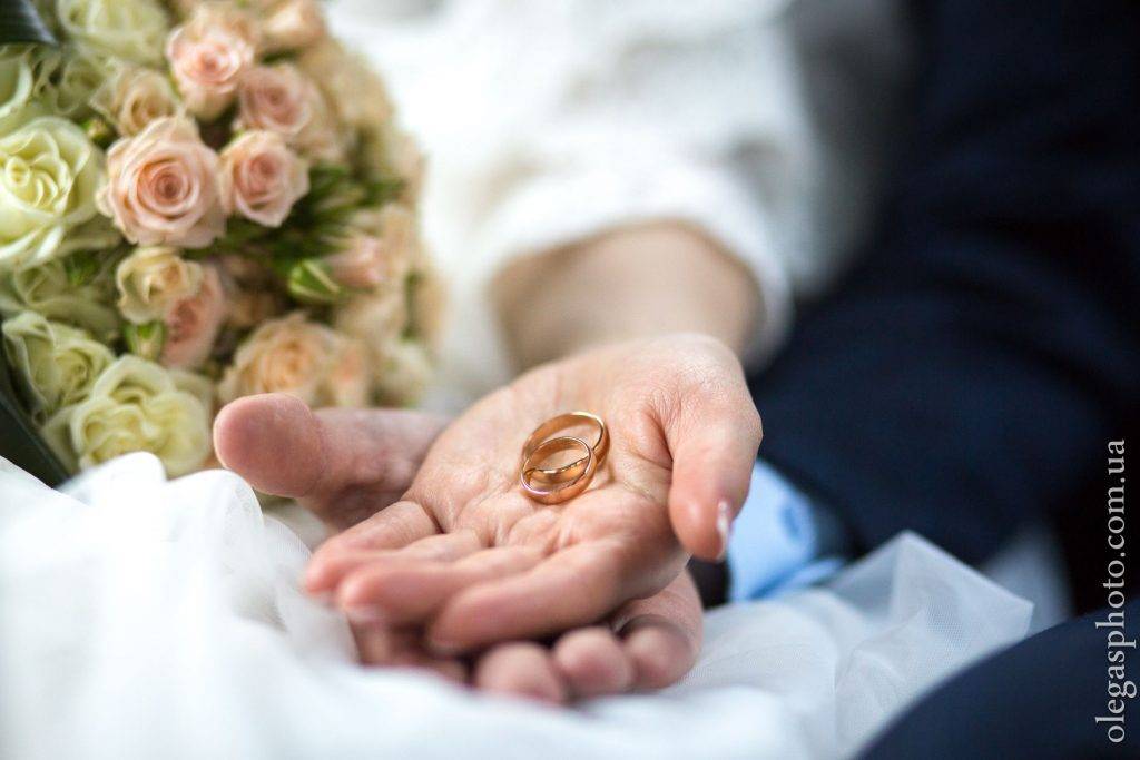 - ладонь невесты направлена вверх, на ней кольца, под ней ладонь жениха;
