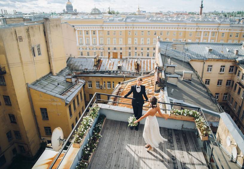 Тем, кто не боится высоты, предлагаем фотосъёмку на крыше. Чем выше здание – тем шикарнее вид. Поезжай заранее на выбранную крышу и проверь, насколько там чисто и насколько удобный подъём.