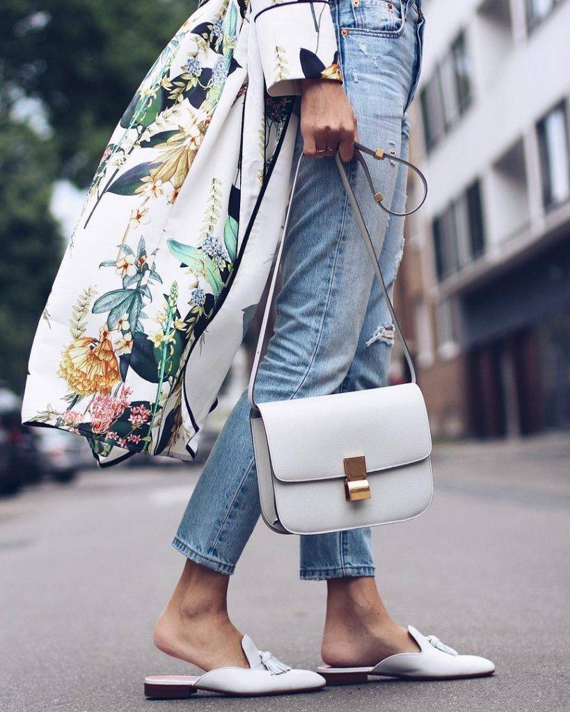 Плетеная обувь с платьем макси и шляпой — расслабленный образ для морского курорта. Для прогулки по городу наденьте кожаные мюли со свободными брюками из легкой ткани, блузой или рубашкой. Прекрасно смотрятся туфли светлого цвета с костюмами в пижамном стиле изумрудного, красного и василькового оттенка.