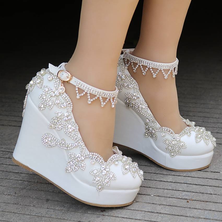 Важно: часто девушки выбирают обувь на высоком каблуке только потому, что иначе подол взятого напрокат (или купленного с намерением потом продать) платья волочится по земле. Это неудачное решение, лучше подобрать юбку изнутри временными закрепами так, чтобы впоследствии было легко их распустить.. Если свадьба будет происходить на пляже, можно вовсе отказаться от обуви, выбрав взамен оригинальные украшения для ног