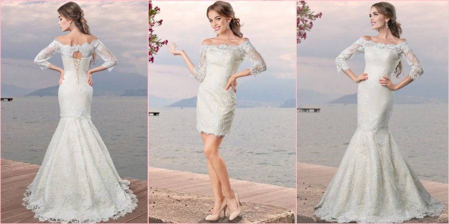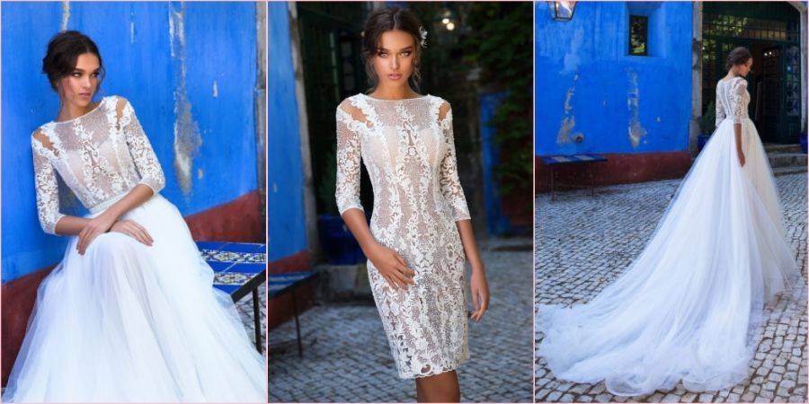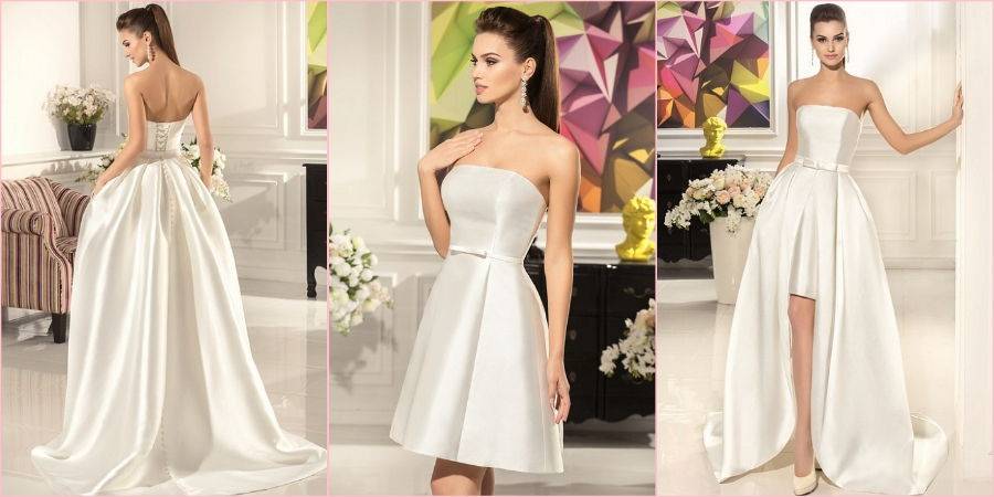 Самым распространенным вариантом является очень пышный наряд в пол. Ведь все девушки хотят в свой свадебный день выглядеть нежно и женственно, но не всем захочется ходить с утра до вечера в неудобном длинном платье с обручами. Именно для таких новобрачных создано изделие с отстегивающейся объемной макси юбочкой, которое с легкостью превратится в удобное и модное коктейльное платьице.