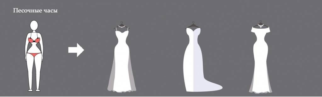 Фигура типа «песочные часы» выглядит очень женственно, а потому невестам с такими пропорциями подойдут многие фасоны — практически все. Можно сделать дополнительный акцент на талии при помощи контрастного пояса. Хорошо будут смотреться платья, плотно облегающие грудь и бёдра. При выборе платья, кроме типа фигуры, следует учесть следующие особенности: