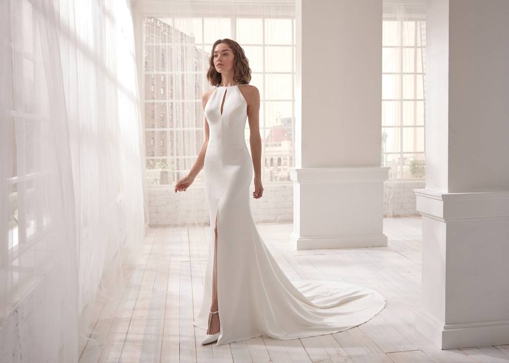 Прямые закрытые свадебные платья позволяют создать стильный образ. Выделяют несколько разновидностей этой модели. Наряд длиной мини сочетают с длинными рукавами. Длинное платье с воротником может иметь укороченные рукава. Закрытые модели свадебного платья комбинируют с пиджаками и меховыми жилетками.