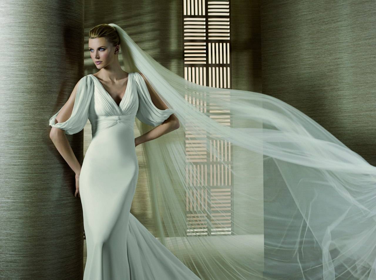 В качестве акцента в силуэте должно быть подчеркнуто декольте – это может быть открыты лиф в форме сердечка или стильный V-образный вырез с рукавом, в зависимости от предпочтений невесты. Шлейф тоже будет уместно смотреться в таком образе.