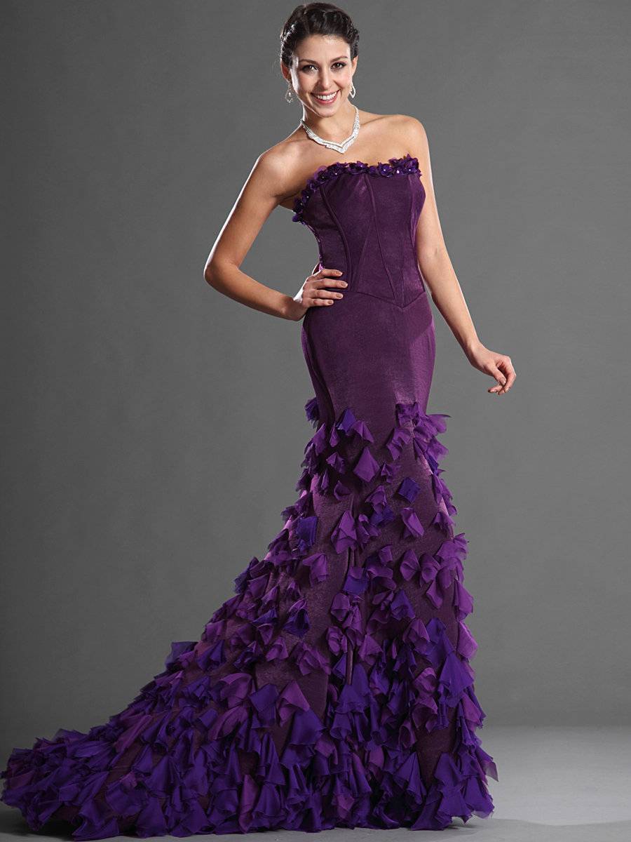 Фиолетовое платье с пышным убранством и многоуровневым фатином подходит под любой тип фигуры. Невеста будет выглядеть великолепно если добавить к образу детали в желтом цвете, например, букет из желтых цветов.