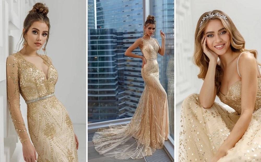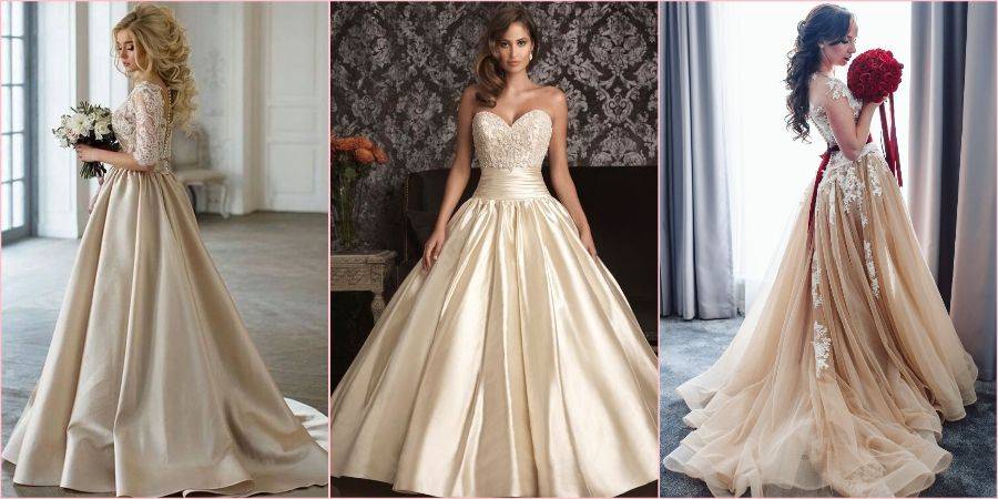 Дизайнеры предлагают свадебные платья золотистого цвета разных фасонов. С помощью правильно подобранного кроя невеста может скорректировать фигуру