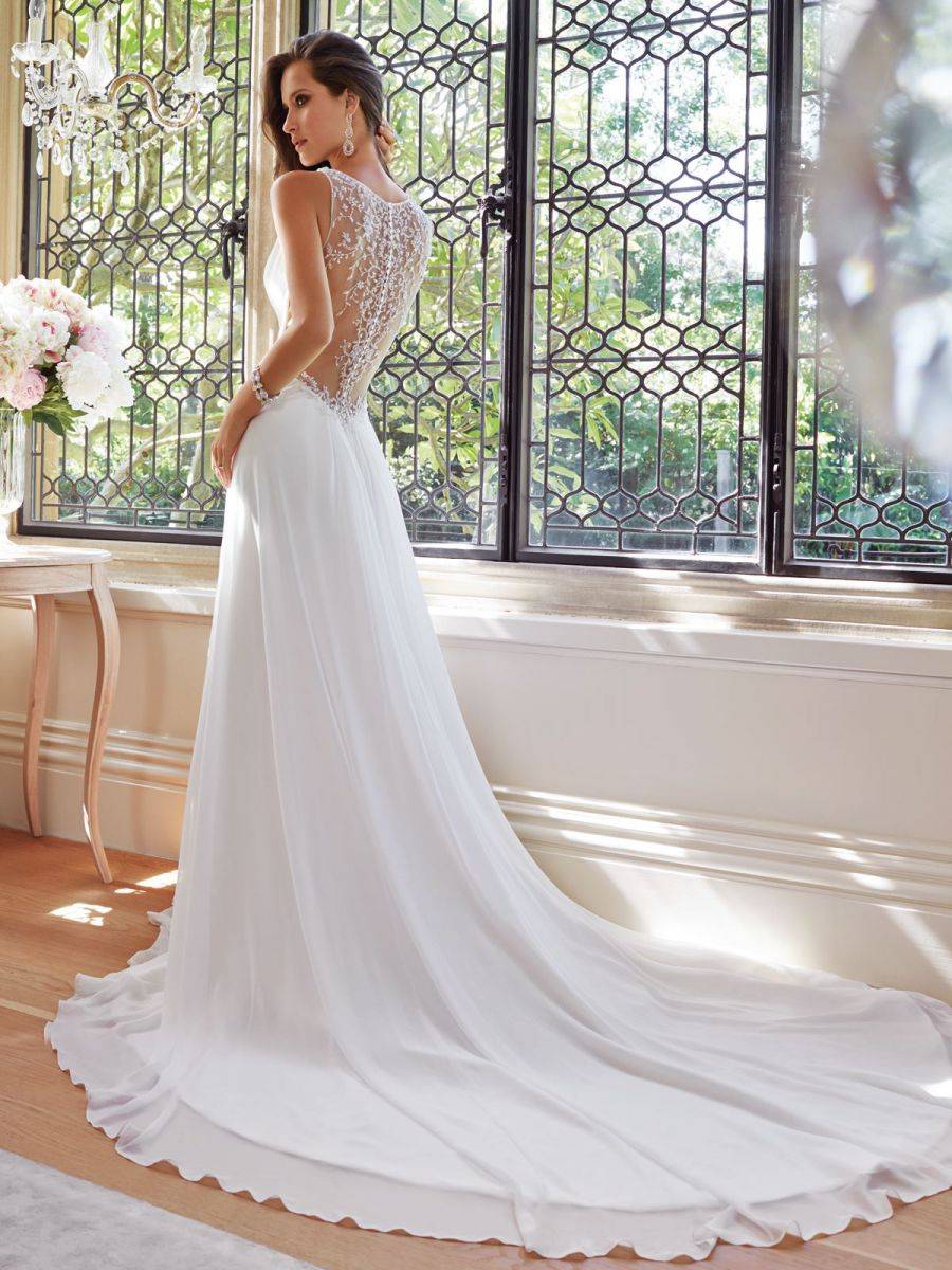 Открытые свадебные платья позволяют сделать акцент на хрупких плечах, изящных ключицах, спине и ногах. Они получили свое распространение еще в середине 50-х годов. Особой популярностью пользуются модели с приспущенными бретелями. Они смотрятся романтично и соблазнительно.